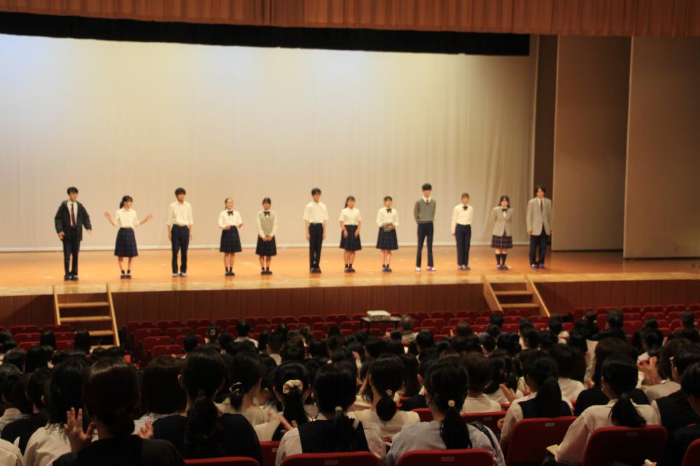 午前の中学校、午後の高校とも本校の生徒がお客様をお迎えしたり壇上で発表をしたりしました。