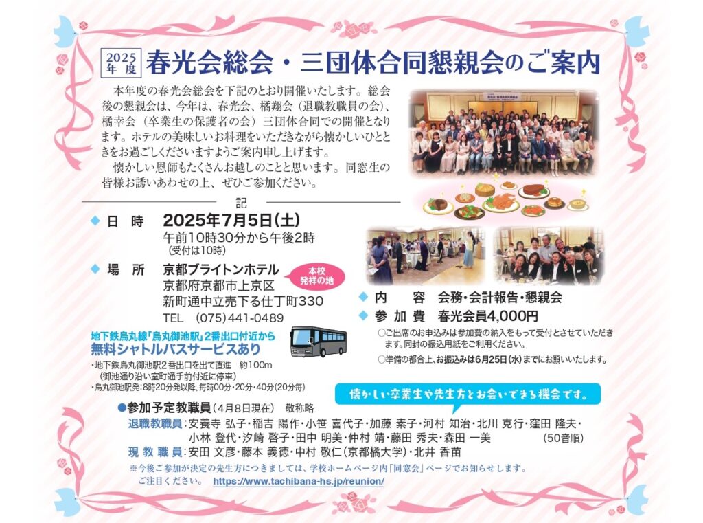 2025/05/10総会・懇親会 2025年7月5日(土)春光会総会・懇親会のご案内 ・会報誌未着の方は、事務局(TEL075-623-0066)までご連絡ください。 会報誌と振込用紙をお送りします。 ・参加予定教職員の最新情報は、追ってお知らせいたします。
