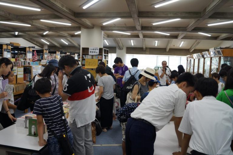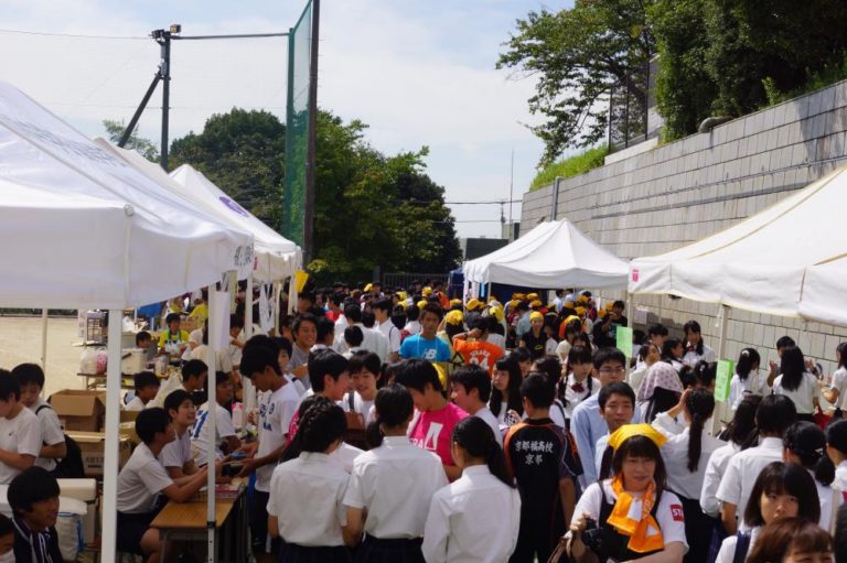 高3父母の会のバザーや図書委員会主催の古本市には長蛇の列も。グラウンド横の模擬店も大賑わいです。