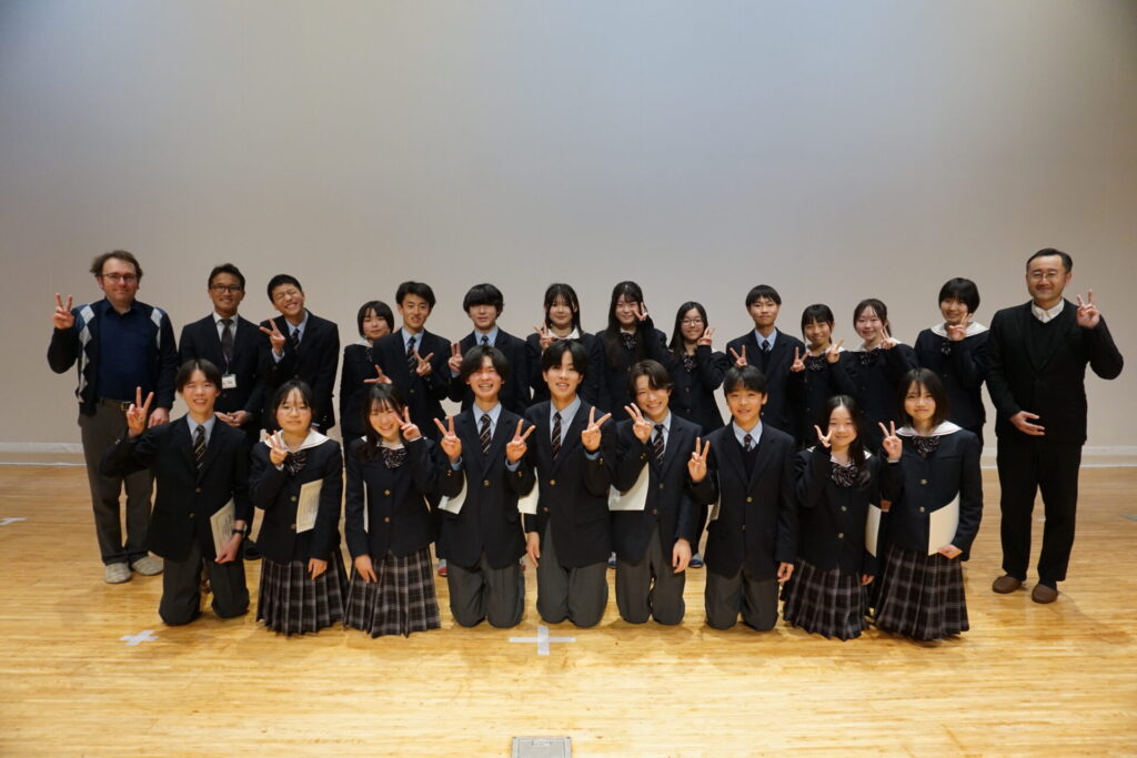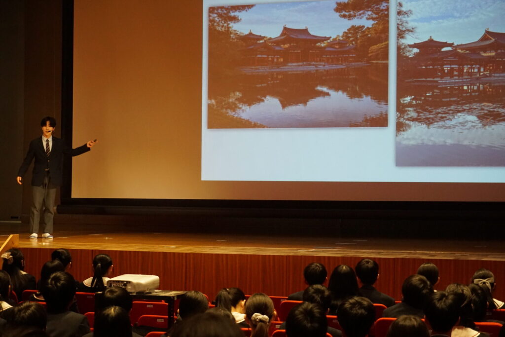 抑揚やスピード、ジェスチャーも考えられ、中学生全員が見守る中でも壇上で堂々と振る舞っていました。