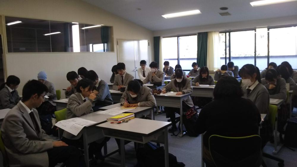 2019/12/18学習・進路指導 英検集会 テスト返却日の12月16日(月)1月実施の英検に向けて希望者対象の集会がありました。 この日集まったのは2級・準1級を目指す高校1・2年の生徒たちです。クラブの関係で出席できなかった生徒たちには別途説明がされました。朝活(朝に行う自主学習のこと)の説明や、検定までの学習アドバイスがあり、生徒たちは熱心にメモを取っていました。
