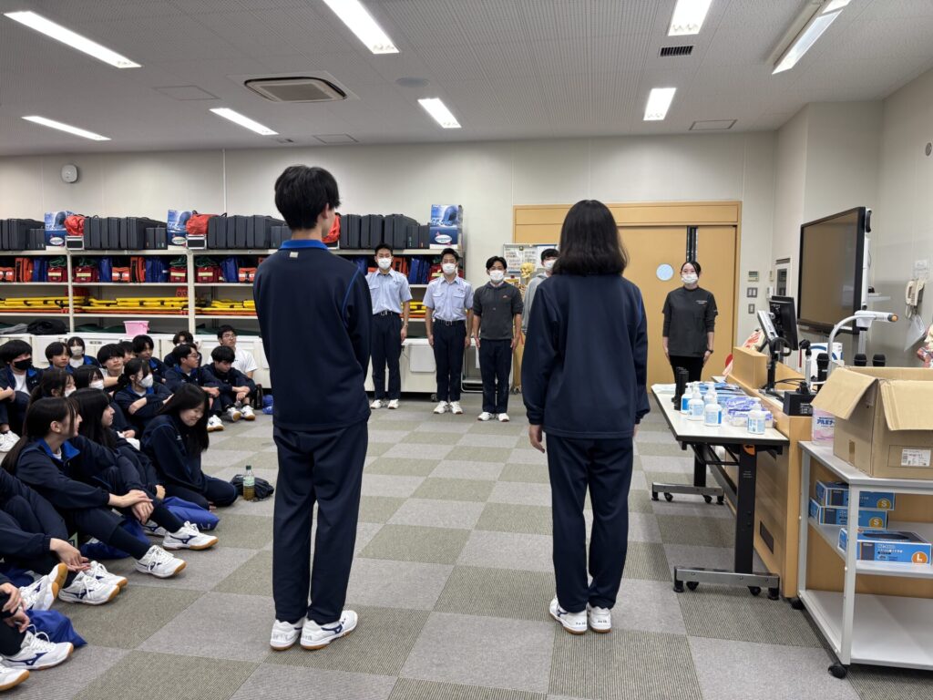 大学の先生方や学生の皆様に丁寧に教えていただきながら、手指消毒・止血、心肺蘇生の方法を学びました。
