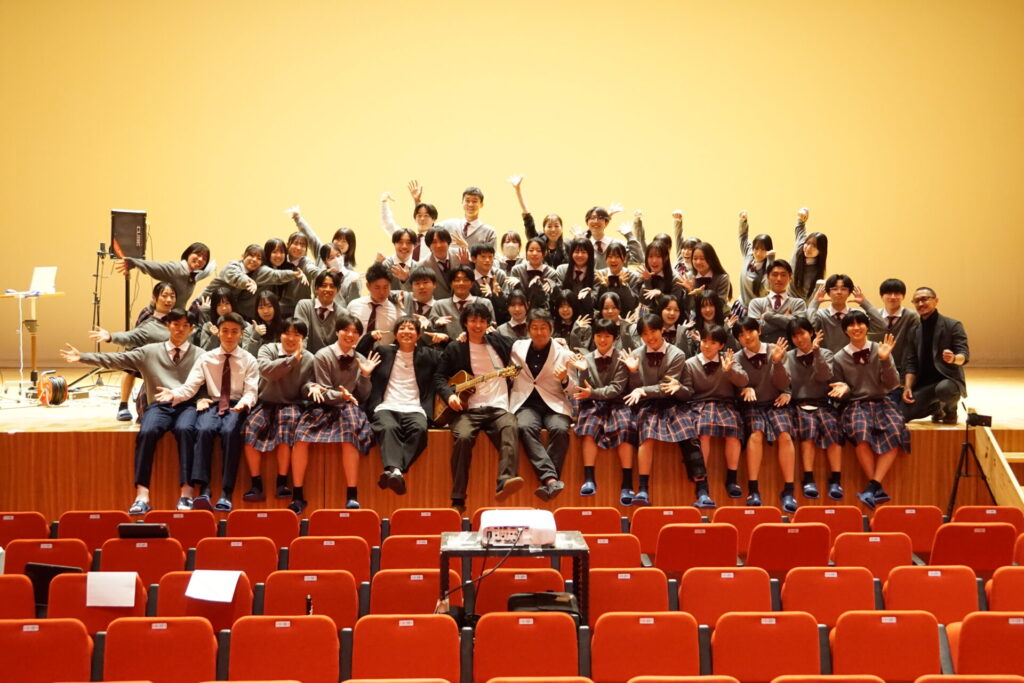 高校3年私大クラスが受講している橘みらい講座のWell-Being講座では、シンガーソングライターのMOTOYAさん、国友重希さんとともにワークショップを行い、オリジナルソングづくりに取り組んできました。
