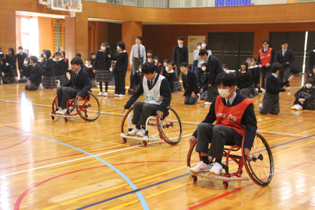 車いすバスケットボール競技用車いすでリレーをしました。生徒たちは貴重な経験ができ、感謝をお伝えしていました。