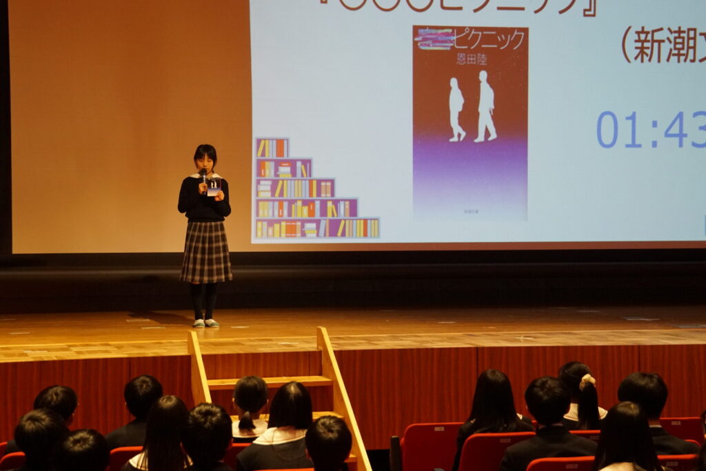 学年主任からは「人との出会い、本との出会い」についての挨拶があった後、各クラス代表の3名、計9名が壇上でお勧めの本について熱く語りました。